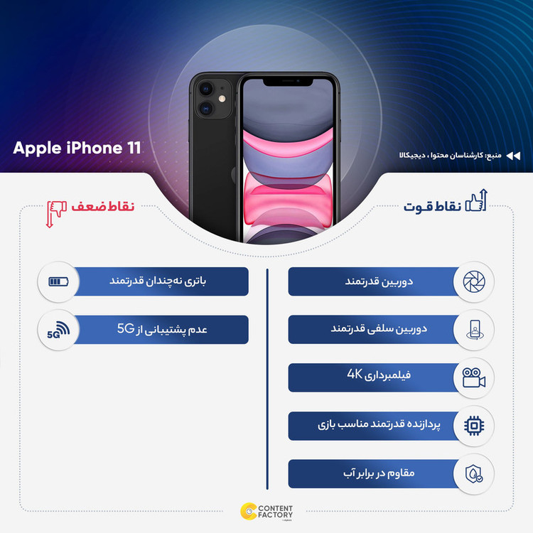 گوشی موبایل «iPhone 11» یکی از سه گوشی شرکت اپل است که در کنفرانس سال 2019 این شرکت معرفی شد. این گوشی نسبت به گوشیهای Pro و Pro Max قیمت پایینتری دارد اما طراحی مشابهی با این محصولات دارد. یکی از اصلیترین تفاوتهای گوشی موبایل اپل مدل iPhone 11 تک سیم کارت ظرفیت 128 گیگابایت و رم 4 گیگابایت با دو گوشی دیگر، نمایشگر آیفون 11 است به فناوری Liquid Retina مجهز شده است تا قیمت تمام شده کمتری داشته باشد. البته این نمایشگر رزولوشن رضایتبخشی دارد؛ بهطوریکه در اندازهی 6.1 اینچیاش، حدود 326 پیکسل را در هر اینچ جا داده است که میزان مطلوبی به حساب میآید. قاب پشتی آیفون جدید هم از شیشه ساخته شده تا هم گوشی مشکل آنتندهی نداشته باشد و هم امکان شارژ بیسیم باتری در این گوشی وجود داشته باشد. البته قابی آلومینیومی این بدنه شیشهای را در خود جای داده است. این بدنهی زیبا در مقابل خطوخش مقاومت زیادی دارد؛ پس خیالتان از این بابت که آب و گردوغبار بهراحتی روی آیفون 11 تأثیر نمیگذارد، راحت باشد. علاوهبراین لکه و چربی هم روی این صفحهنمایش باکیفیت تأثیر چندانی ندارند اما این هم پایان کار نیست، آیفون جدید میتواند به مدت 30 دقیقه در عمق 2 متری آب دوام بیاورد. تشخیص چهره با استفاده از دوربین جلو دیگر ویژگی است که در آیفون جدید اپل به کار گرفته شده است. اما جالبترین و واضحترین تفاوت در این محصول جدید، دوربینهایی است که به شکل دوگانه در قاب پشتی جا خوش کردهاند. دو دوربین با سنسورهای 12مگاپیکسلی عکسهایی با کیفیتِ کاملاً رضایتبخش و ضبط ویدیو 4K را به کاربر هدیه میدهد. دو دوربین که یکی از آنها SL سهبعدی است هم دیگر بهروزرسانی در آیفون 11 است. قابلیت اتصال به شبکههای 4G، بلوتوث نسخهی 5، نسخهی 13 iOS دیگر ویژگیهای آيفون يازده هستند. ازنظر سختافزاری هم این گوشی از تراشهی جدید A13 Bionic بهره میبرد که تا بتواند علاوه بر کارهای معمول، از قابلیتهای جدید واقعیت مجازی که اپل این روزها روی آن تمرکز خاصی دارد، پشتیبانی کند. گوشی جدید اپل به باتری 3110 میلیآمپرساعتی، فناوری شارژ سریع PD2.0، فناوری شارژ بیسیم و استاندارد صوتی دالبی هم مجهز شده است.