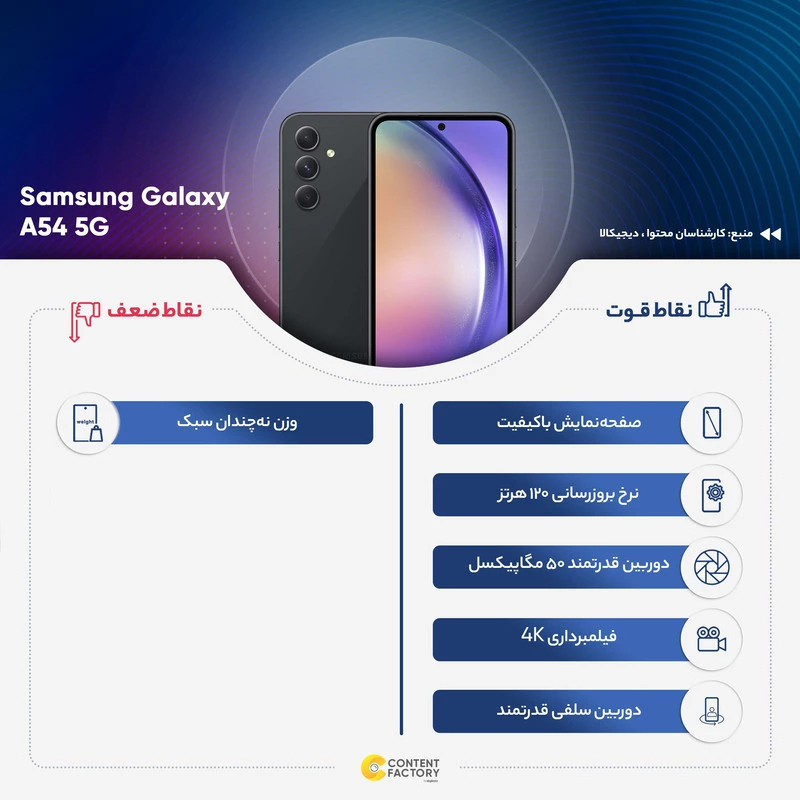 دیدن محصولات مرتبطبا هر سلیقه و توقعی از گوشیهای هوشمند میانرده، باید بدانید که گوشیهای میانرده سری A شرکت سامسونگ، میتوانند نیاز شما را برآورده کنند. سامسونگ Galaxy A54 5G هم با توجه به مشخصات فنی در نظر گرفته شده و البته قیمتی مقرون بهصرفه، ارزش خرید بالایی دارد. صفحهنمایش باکیفیت 6.4 اینچی این گوشی با رزولوشن بسیار خوب و حداکثر روشنایی 1000 نیت، در شرایط نوری متنوع و حتی زیر تابش مشتقیم نور خورشید هم، وضوح تصویر بسیار خوبی را ارائه میکند. حضور سنسور قدرتمند عریض (اصلی) برای ثبت تصاویر بسیار جذاب در نور روز و نور شب، سنسور دوربین فوق عریض 12 مگاپیکسل با زاویه دید گسترده 123 درجه که مناسب عکاسی در طبیعت است و همچنین سنسور 5 مگاپیکسل ماکرو برای ثبت تصاویر از فاصله نزدیک، بهخوبی تمام نیازهای شما را در عکاسی و حتی فیلمبرداری، فراتر از یک گوشی میانرده برآورده میکنند. پردازنده اگزینوس 1380 این گوشی هم سوالی عملکرد بسیار خوب در اجرای بازیهای حتی سنگین، سبب شده تا این گوشی توانایی پشتیبانی از شبکههای اینترنتی پرسرعت 5G را هم داشته باشد. در نهایت باتری 5000 میلیآمپرساعت هم به ازای هر بار شارژ صد درصدی، در شرایط استفاده معمولی، طول عمر مفید (زمان آماده بهکار) دو روز را ارائه میکند. همانطور که میدانید، درون جعبه این گوشی خبری از آداپتور شارژر نیست، اما این گوشی بههمراه شارژر 25 وات سامسونگ به فروش میرسد.