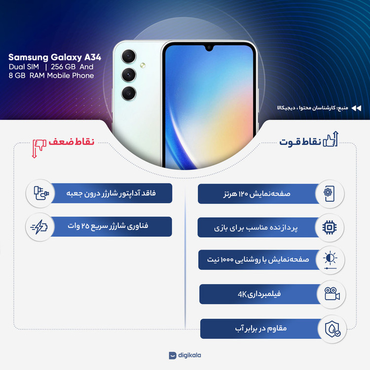 سامسونگ در زمینه گوشیهای هوشمند میانرده تا به امروز توانسته است با معرفی محصولاتی با مشخصات فنی مناسب و قیمتی مقرون بهصرفه، عملکرد بسیار خوبی را به نمایش بگذارد. سامسونگ Galaxy A34 5G هم یکی از این گوشیهای هوشمند دوست داشتنی این شرکت است. صفحهنمایش جذاب و قدرتمند 6.6 اینچی این گوشی با رزولوشن بسیار خوب و نرخ بروزرسانی فوقالعاده 120 هرتز، چیزی کم از یک پرچمدار ندارد و سامسونگ دوباره ثابت کرد که در زمینه صفحهنمایش هنوز هم حرفهای بسیاری برای گفتن دارد. در بخش سنسورهای دوربین هم سنسور دوربین عریض 48 مگاپیکسل این گوشی توانایی ثبت تصاویر بسیار جذاب و باکیفیتی را در نور روز و نور شب دارد. سنسور دوربین فوقعریض 8 مگاپیکسل این گوشی هم با زاویه دید 123 درجه، امکان ثبت تصاویر جذابی را در طبیعت و فضای باز دارد. سنسور دوربین 5 مگاپیکسل ماکرو هم برای ثبت تصاویر از فاصله نزدیک این گوشی را همراهی میکند. دوربین سلفی 13 مگاپیکسل این گوشی هم سوای عمکلرد بسیار خوب در نور روز، توانایی فیلمبرداری با نهایت کیفیت 4K را دارد. پردازنده دیمنسیتی 1080 شرکت مدیاتک هم این گوشی را همراهی میکند که سوای عملکرد بسیار خوب در اجرای بازیها حتی سنگین، سبب شده تا این گوشی همانطور که از نامش پیداست، توانایی پشتیبانی از شبکههای اینترنتی نسل پنجم یا همان 5G را داشته باشد. باتری با میزان ظرفیت 5000 میلیآمپرساعت هم به ازای هر بار شارژ صد درصدی در حالت استفاده معمولی، طول عمر مفید (زمان آماده بهکار) دو روز را ارائه میکند. در مجموع باید بگوییم که اگر به دنبال خرید گوشی میانردهای هستید که از صفحهنمایشی در حد و اندازه یک گوشی پرچمدار، سنسورهای دوربین متنوع و قدرتمند و پردازنده مناسب برای اجرای بازیهای سنگین بهره برده باشد، این گوشی میتواند یکی از بهترین انتخابهای ممکن باشد. همانطور که میدانید، درون جعبه این گوشی خبری از آداپتور شارژر نیست، اما این گوشی بههمراه شارژر 25 وات سامسونگ به فروش میرسد.