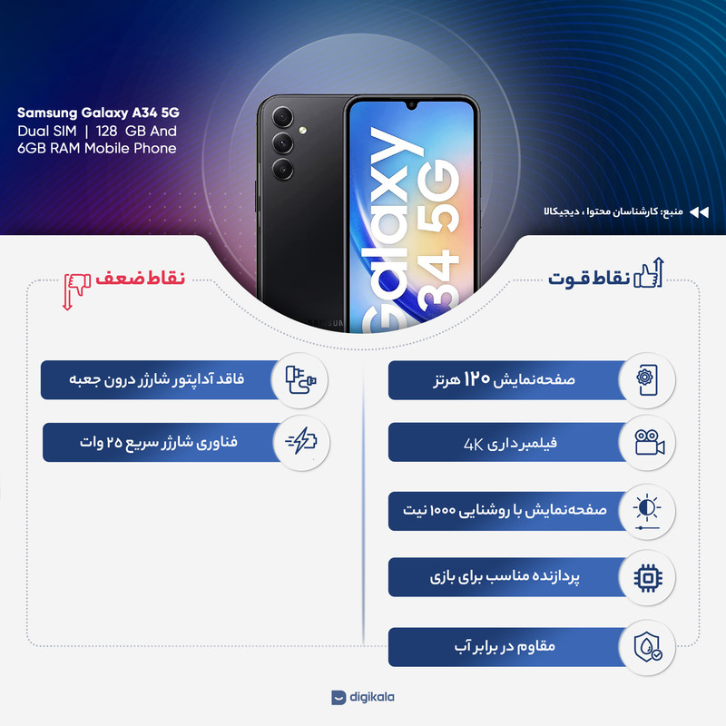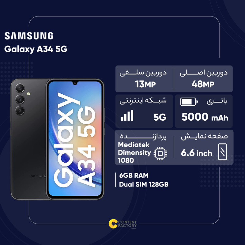 سامسونگ در زمینه گوشیهای هوشمند میانرده تا به امروز توانسته است با معرفی محصولاتی با مشخصات فنی مناسب و قیمتی مقرون بهصرفه، عملکرد بسیار خوبی را به نمایش بگذارد. سامسونگ Galaxy A34 5G هم یکی از این گوشیهای هوشمند دوست داشتنی این شرکت است. صفحهنمایش جذاب و قدرتمند 6.6 اینچی این گوشی با رزولوشن بسیار خوب و نرخ بروزرسانی فوقالعاده 120 هرتز، چیزی کم از یک پرچمدار ندارد و سامسونگ دوباره ثابت کرد که در زمینه صفحهنمایش هنوز هم حرفهای بسیاری برای گفتن دارد. در بخش سنسورهای دوربین هم سنسور دوربین عریض 48 مگاپیکسل این گوشی توانایی ثبت تصاویر بسیار جذاب و باکیفیتی را در نور روز و نور شب دارد. سنسور دوربین فوقعریض 8 مگاپیکسل این گوشی هم با زاویه دید 123 درجه، امکان ثبت تصاویر جذابی را در طبیعت و فضای باز دارد. سنسور دوربین 5 مگاپیکسل ماکرو هم برای ثبت تصاویر از فاصله نزدیک این گوشی را همراهی میکند. دوربین سلفی 13 مگاپیکسل این گوشی هم سوای عمکلرد بسیار خوب در نور روز، توانایی فیلمبرداری با نهایت کیفیت 4K را دارد. پردازنده دیمنسیتی 1080 شرکت مدیاتک هم این گوشی را همراهی میکند که سوای عملکرد بسیار خوب در اجرای بازیها حتی سنگین، سبب شده تا این گوشی همانطور که از نامش پیداست، توانایی پشتیبانی از شبکههای اینترنتی نسل پنجم یا همان 5G را داشته باشد. باتری با میزان ظرفیت 5000 میلیآمپرساعت هم به ازای هر بار شارژ صد درصدی در حالت استفاده معمولی، طول عمر مفید (زمان آماده بهکار) دو روز را ارائه میکند. در مجموع باید بگوییم که اگر به دنبال خرید گوشی میانردهای هستید که از صفحهنمایشی در حد و اندازه یک گوشی پرچمدار، سنسورهای دوربین متنوع و قدرتمند و پردازنده مناسب برای اجرای بازیهای سنگین بهره برده باشد، این گوشی میتواند یکی از بهترین انتخابهای ممکن باشد. همانطور که میدانید، درون جعبه این گوشی خبری از آداپتور شارژر نیست، اما این گوشی بههمراه شارژر 25 وات سامسونگ به فروش میرسد.