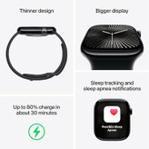 ساعت هوشمند اپل مدل Series 10 با ابعاد 46x39x9.7 میلیمتر و وزن 35.3 گرم، محصولی مناسب برای آقایان و بانوان است که هم در فعالیتهای روزمره و هم در موقعیتهای رسمی و ورزشی قابل استفاده است. جنس بدنه این ساعت از آلومینیوم بوده و در ساخت آن از شیشه Ion-X و سرامیک سافایر بهره گرفته شده است. صفحه نمایش 1.96 اینچی آن از نوع Retina LTPO3 OLED با وضوح 416x496 پیکسل و تراکم 326 پیکسل بر اینچ بوده که قابلیت روشنایی بین 1 تا 2000 نیت را دارد. این ساعت با سیستم عامل WatchOS نسخه 11 و پردازنده Apple S10 عرضه شده و از فناوریهای مکانیابی GPS، A-GPS، GLONASS، GALILEO، BDS و QZSS پشتیبانی میکند. ساعت هوشمند اپل مجهز به حسگرهای متعددی از جمله قطبنما، شتابسنج، ضربان قلب، سنجش اکسیژن خون، ژیروسکوپ، ارتفاعسنج و سنجش دمای بدن است. همچنین، قابلیت نمایشگر همیشه روشن، پایش وضعیت خواب، محاسبه کالری مصرفی و مسافت طیشده، تشخیص تصادف و سقوط از ارتفاع و پشتیبانی از Siri از دیگر ویژگیهای این محصول است. باتری لیتیوم یونی این ساعت با یک بار شارژ میتواند تا 18 ساعت در حالت عادی و 36 ساعت در حالت ذخیره انرژی کار کند. بهعلاوه، این ساعت در برابر آب تا عمق 50 متر مقاوم است و دارای گواهی IPX6 برای مقاومت در برابر گرد و غبار است. گفتنیست که قابلیت استفاده از سنسور اکسیژن خون وجود ندارد.