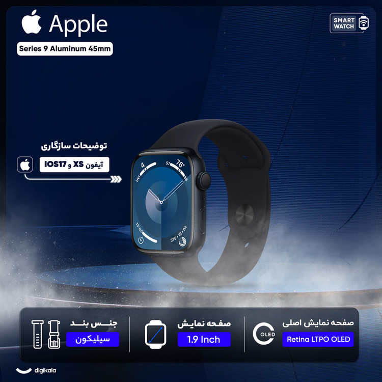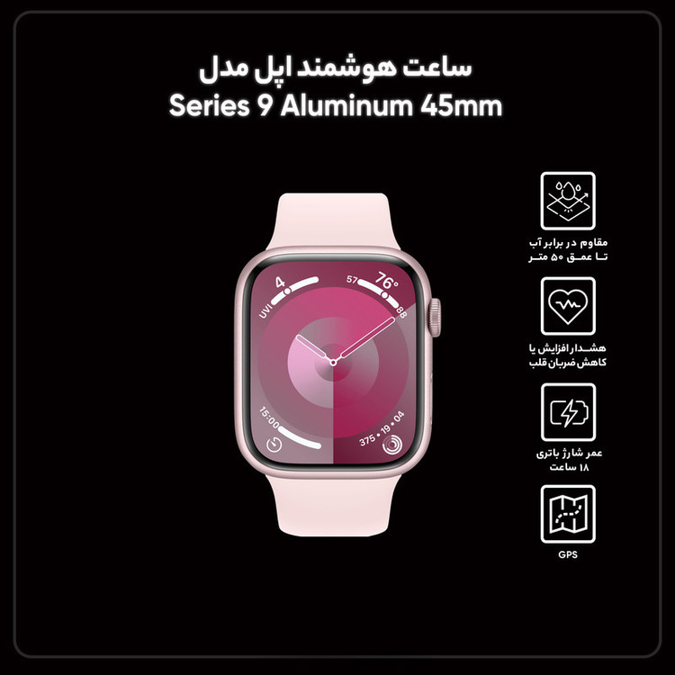 ساعتهای هوشمند اپل همواره توانستهاند با بهره بردن از مشخصات فنی مناسب، عملکرد بسیار خوبی را بهنمایش بگذارد و ساعت هوشمند اپل مدل Series 9 Aluminum 45mm هم یکی از گجتهای پوشیدنی قدرتمند این شرکت است. این ساعت با پشتیبانی از استاندارد IP6X، توانایی مقاومت در عمق 50 متری آب را دارد و میتوانید بدون هیچگونه نگرانی از آن در ورزشهای آبی و شرایط جوی متنوع استفاده کنید. یکی از قدرتمندترین مشخصات در نظر گرفته شده برای این ساعت هوشمند بدون شک صفحهنمایش آن است. صفحهنمایش با ابعاد 1.9 اینچ و رزولوشن 484×396 پیکسل از نوع Retina LTPO OLED که وضوح تصویر بسیار خوب و باکیفیتی را به شما ارائه میکند و از طرفی باید بدانید که میزان روشنایی فوقالعاده 2000 نیت (nits) آن سبب شده تا در شرایط نوری متنوع و حتی زیر تابش مستقیم نور خورشید هم وضوح تصویر بسیار خوب و کاملا خوانایی را از آن شاهد خواهید بود. حضور پردازنده جدید و قدرتمند Apple S9 سبب شده تا این گوشی عملکرد بسیار دقیق و روان را در حالتهای مختلف به شما ارائه کند. از طرفی نرمافزارهای کاربردی و سلامت جذابی هم برای این ساعت در نظر گرفته شده که در کنار حسگرهای قدرتمند، عملکرد بسیار دقیقی دارند. قابلیتهای سلامت همچون شمارشگر ضربان قلب و کنترل میزان اکسیژن موجود در خون هم این ساعت هوشمند را همراهی میکنند. رابط کاربری جذاب این ساعت قابلیتهای کاربردی فراوانی را با خود بههمراه داشته که میتوانیم به واچ فیسهای متنوع و البته امکان پیدا کردن گوشی به وسیله قابلیت مکانیابی را اشاره کنیم. باتری 308 میلیآمپرساعت هم از دیگر مشخصات در نظر گرفته شده است. در مجموع میتوانیم با خیال راحت بگوییم که اگر به دنبال خرید ساعت هوشمند همهچیز تمامی هستید که در هر شرایطی از آن استفاده کنید و عملکرد بسار خوب و باکیفیتی را شاهد باشید، ساعت هوشمند اپل مدل Series 9 Aluminum 45mm میتواند یکی از بهترین گزینههای ممکن برای شما باشد. گفتنیست که قابلیتهای سنجش فشار خون و اکسیژن خون در کشور ایران قابل استفاده نیست.