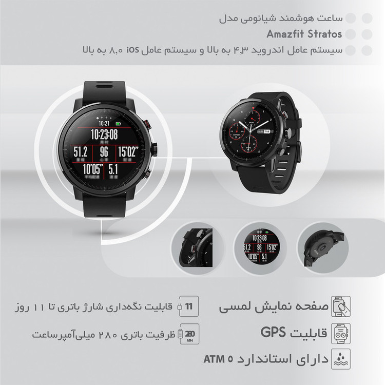 ساعت هوشمند شیائومی مدل Amazfit Stratos را می توان نسل دوم ساعت هوشمند شیائومی مدل Amazfit Pace به حساب آورد که از نظر طراحی و همچنین امکانات دچار تغییرات متعددی شده است. شیائومی از پلی کربنات تقویت شده برای ساخت بدنه این ساعت استفاده کرده که بسیار مقاوم و در عین حال سبک است. بر روی این ساعت یک صفحه نمایش ۱٫۳۴ اینچی با رزولوشن ۳۲۰×۳۰۰ پیکسل قرار گرفته است و برای ساخت قاب این صفحه نمایش از سرامیک استفاده شده است. همچنین شیائومی برای ساخت دکمهها و محل شارژ این ساعت از استیل ضد زنگ ۳۱۶L استفاده کرده است. ساعت هوشمند شیائومی مدل Amazfit Stratos به گونهای طراحی شده است که قابلیت استفاده در آب را دارد و میتواند تا عمق ۵۰ متری فشار وارده را تحمل کند و این مسئله موجب میشود این ساعت هوشمند برای شناگران یک انتخاب مناسب باشد. این ساعت هوشمند علاوه بر شنا میتواند ۱۰ حالت مختلف دیگر مانند دویدن، راه رفتن، دوچرخه سواری در فضای باز، دوچرخه سواری در محیط داخلی، دویدن در محیط داخلی (تردمیل)، کوهنوردی، دو میدانی و .. را تشخیص دهد و اطلاعات آن را به صورت جداگانه ثبت کند. این ساعت دارای یک باتری 280 میلی آمپری است که شارژ کامل آن در حدود 2 ساعت طول میکشد. باتری ساعت هوشمند شیائومی مدل Amazfit Stratos بسیار قدرتمند است و حتی با روشن بودن قابلیت ردیابی GPS با یکبار شارژ می تواند تا 35 ساعت پاسخگوی نیاز شما باشد. از دیگر مشخصات این ساعت هوشمند میتوان به مشاهده هشدارهای تماس، تنظیم کردن ساعت، نظارت بر الگوی خواب خود، بررسی آب و هوا از طریق برنامه و قابلیت نظارت ۲۴ ساعته ضربان قلب اشاره کرد. ساعت هوشمند ۲ Amazfit همچنین از اپلیکیشن Amazfit Watch 2,0 و Yue Run circle و دیگر برنامههای شخص ثالث پشتیبانی میکند و شما به آسانی با استفاده از این اپلیکیشنها میتوانید از اطلاعات ورزش خود و همچنین وضعیت بدنی خود مطلع شوید.