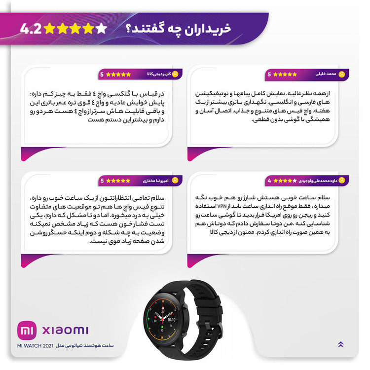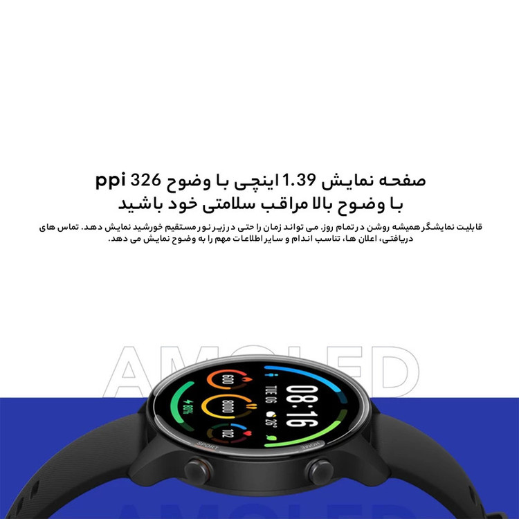 ساعتهای هوشمند شیائومی از سری لوازم جانبی جذاب و پرکاربردی هستند که همواره طرفداران این کمپانی برای رونمایی از آن در کنار سایر دستگاههای شیائومی انتظار میکشند. MI WATCH تولید 2021 جدید ترین ساعت هوشمند کمپانی شیائومی است که روانه بازار شده است. این ساعت دارای یک صفحه نمایش گرد بزرگ، روشن و بسیار با کیفیت است و طراحی ساده و در عین حال خاص و چشم نوازی دارد. این ساعت با یک باتری لیتیوم یون با ظرفیت 420 میلی آمپر ساعت کار می کند. الگوریتم های بهینه سازی مصرف Al، دوام باتری را افزایش می دهند و شما می توانید در این نسخه با یک بار شارژ کامل و استفاده معمولی تا 16 روز با ساعت کار کنید. علاوه بر این شارژر مغناطیسی، باتری را با سرعت بالایی شارژ می کند.. از دیگر ویژگی های قابل توجه این محصول باید به پشتیبانی از سیستم GPS، پشتیبانی از ورزش های متنوع و امکان نظارت بر ضربان قلب و سطح اکسیژن خون اشاره کرد. Mi Watch دارای یک صفحه نمایش گرد 1.39 اینچی همیشه روشن است که قابلیت نمایش اطلاعات را حتی در زیر نور مستقیم آفتاب دارد. این نمایشگر از نوع AMOLED بوده و تماس های دریافتی، نوتیفیکیشن ها، گزینه های تناسب اندام و دیگر اطلاعات مهم را با وضوح بالا به شما نمایش خواهد داد. به دلیل استفاده از قاب جدید، وزن آن فقط 32 گرم است. وزن کم ساعت به شما اجازه می دهد تا انرژی خود را آزاد کرده و فعالیت های ورزشی لذت بخشی را تجربه کنید. همچنین ساعت تا عمق 50 متری در برابر آب مقاوم می باشد. ساعت به تراشه 12 نانومتری پیشرفته GPS با چهار حالت مختلف مجهز است که حرکات شما را به دقت ثبت می کنند. همچنین ساعت با الگوریتم های بهینه سازی مسافت طی شده کار می کند تا حرکات و دقت مسافت پیموده شده را بهبود ببخشد و اطلاعات تناسب اندام دقیق تری را به شما ارائه دهد. Mi Watch جدید از 17 حالت ورزشی حرفه ای از جمله مسابقات سه گانه و شنا، و همچنین 100 حالت ورزشی دیگر پشتیبانی می کند. الگوریتم قدرتمند Firstbeat قابلیت نظارت دقیق و آنالیز بیش از سی نقطه کلیدی مثل ضربان قلب، سرعت و کالری مصرف شده را دارد و تمرینات شما را کارآمدتر می کند. با لمس دکمه SPORT می توانید ورزش مورد علاقه خود را آغاز کنید!