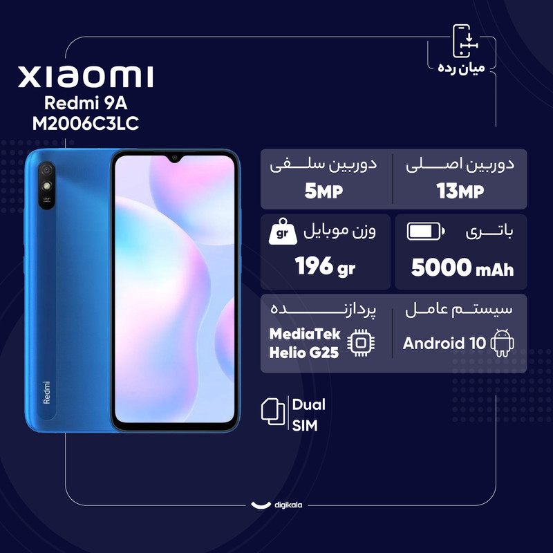 دیدن محصولات مرتبطشرکت شیائومی بهتازگی دو عضو ارزانقیمت از خانواده «Redmi 9» را معرفی کرده است. گوشی Redmi 9A یکی از این گوشیها است که مانند نسخههای قبلی، از صفحهنمایش بزرگ، باتری پرقدرت، طراحی جذاب دوربین و سختافزار مناسب برخوردار است. Redmi 9A به صفحهنمایش با ابعاد 6.53 مجهز شده است و از فناوری IPS LCD بهره میبرد. این نمایشگر حدود 81 درصد از بدنه را به خود اختصاص داده است. شیائومی برای این محصول خود از یک دوربین با لنز عریض 13 مگاپیکسلی استفاده کرده است. دوربین سلفی 5 مگاپیکسلی هم در مرکز گوشی و بالای نمایشگر این گوشی بهکار گرفتهشده است. ازنظر سختافزاری هم این گوشی به تراشه Helio G25 شرکت مدیاتک مجهز شده که با پردازنده هشتهستهای و قدرتمند Cortex-A53 و پردازنده گرافیکی PowerVR GE8320 همراه شده است. حافظه رم با ظرفیت 4 گیگابایت هم در کنار این مجموعه قرار گرفته است تا بتواند علاوهبر کارهای معمول، از قابلیتهای جدید گوشیهای امروزی پشتیبانی کند. برای این گوشی حافظه داخلی با ظرفیت 64 گیگابایت در نظر گرفته شده است که با استفاده از یک کارت حافظه SD قابل ارتقاء است. باتری لیتیوم-پلیمری با ظرفیت 5000 میلیآمپرساعتی با قابلیت شارژ با توان 10 وات و جک 3.5 میلیمتری صدا هم از دیگر مشخصات این محصول جدید است.
