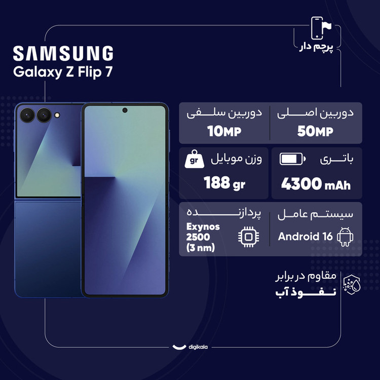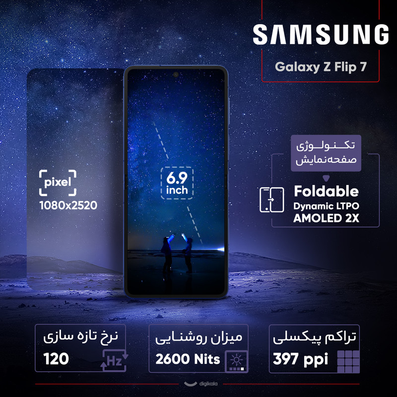 گوشی Samsung Galaxy Z Flip 7 نسل جدید گوشیهای تاشوی محبوب سامسونگ است که در سال ۲۰۲۵ با طراحی زیباتر، سختافزار قویتر و امکانات کاربردیتر معرفی شد. این گوشی در حالت باز، نمایشگری ۶.۹ اینچی Dynamic AMOLED 2X با نرخ نوسازی ۱۲۰ هرتز و روشنایی چشمگیر ۲۶۰۰ نیت ارائه میدهد که تجربهای روان، روشن و خیرهکننده را فراهم میکند. در حالت بسته نیز نمایشگر ثانویهی ۴.۱ اینچی Super AMOLED با قابلیت تعامل کامل، پاسخ سریع به پیامها، کنترل موسیقی و حتی گرفتن سلفی با دوربین اصلی را امکانپذیر میسازد. Flip 7 به تراشهی قدرتمند Exynos 2500 با لیتوگرافی ۳ نانومتری مجهز شده و در کنار ۱۲ گیگابایت رم و حافظه پرسرعت UFS 4.0، اجرای سریع و بدون لگ اپلیکیشنها و بازیها را تضمین میکند. دوربین اصلی دوگانه ۵۰+۱۲ مگاپیکسلی با لرزشگیر اپتیکال و پشتیبانی از HDR10+، تصاویری با جزئیات بالا ثبت میکند و قابلیت فیلمبرداری تا 4K را دارد. باتری ۴۳۰۰ میلیآمپرساعتی، شارژ سریع ۲۵ واتی، شارژ بیسیم، و پشتیبانی از DeX، Wi-Fi 7، بلوتوث 5.4 و UWB هم این گوشی را به انتخابی ایدهآل برای کاربرانی تبدیل کرده که بهدنبال ترکیب طراحی خاص، قدرت بالا و انعطافپذیری هستند.
