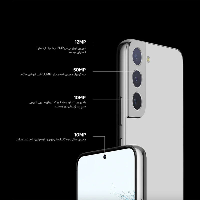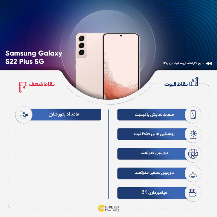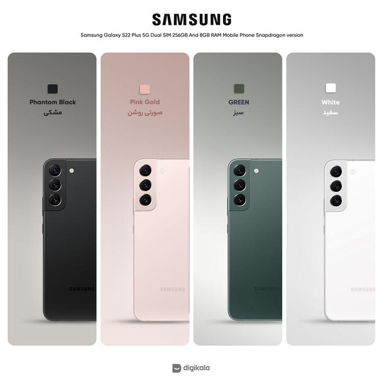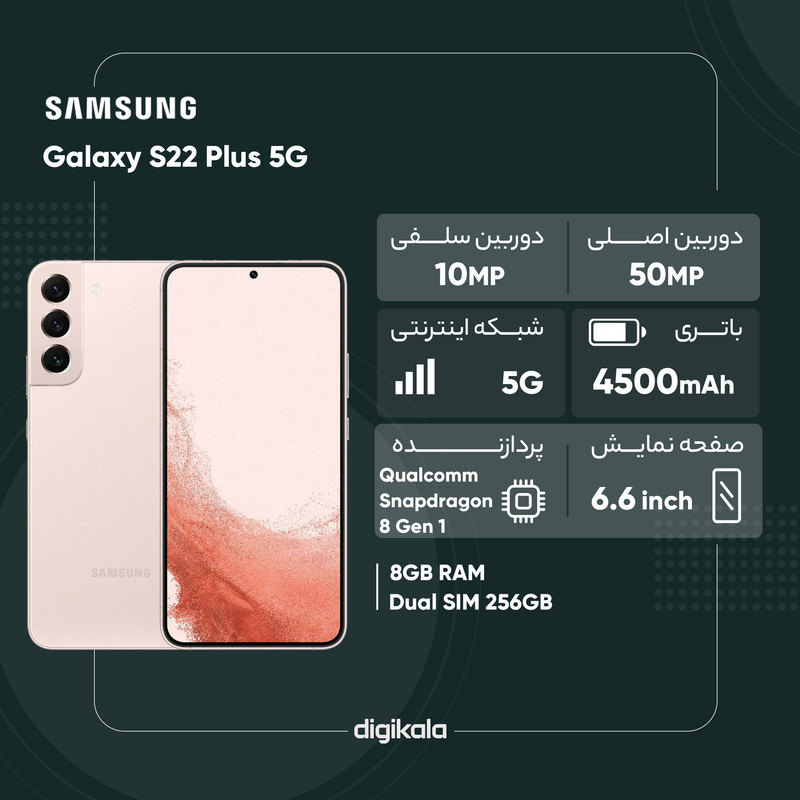 سامسونگ Galaxy S22 Plus 5G در کنار دو گوشی هوشمند دیگر خانواده Galaxy S22 معرفی شد و در جایگاه یک گوشی هوشمند پرچمدار از مشخصات فنی قدرتمندی هم بهره برده است. طراحی کلی در نظر گرفته شده برای این گوشی هوشمند، تفاوت چندانی با مدل Galaxy S21 Plus ندارد. در نمای روبهرویی شاهد حضور صفحهنمایش زیبا با ابعاد 6.6 اینچ و رزولوشن 1080×2340 پیکسل از نوع Dynamic AMOLED 2X هستیم. صفحهنمایش بسیار قدرتمند که توانایی نمایش 393 پیکسل در هر اینچ و نرخ بروزرسانی 120 هرتز را دارد. بدون شک سامسونگ Galaxy S22 Plus 5G به یکی از قدرتمندترین صفحاتنمایش در بین گوشیهای هوشمند پرچمدار مجهز شده است. در نمای پشتی هم سه سنسور دوربین برای این گوشی هوشمند در نظر گرفته شده است. یک سنسور دوربین اصلی با رزولوشن 50 مگاپیکسل و گشودگی دریچه دیافراگم f/1.8 از نوع عریض در کنار یک سنسور 10 مگاپیکسل از نوع تله فوتو با قابلیت زوم 3 برابری اپتیکال . سنسور 12 مگاپیکسل فوق عریض (ultrawide) با زاویه دید 120 درجه، سنسورهای دوربین سهگانه سامسونگ Galaxy S22 Plus 5G را تشکیل میدهند. حضور پردازنده قدرتمند اسنپدراگون 8 نسل یک شرکت کوالکام هم سبب شده تا این گوشی بهراحتی از پس سنگینترین بازیهای روز دنیا، مثل کالآفدیوتی موبایل و آسفالت 9 برآید. در بخش باتری هم این گوشی به باتری با میزان ظرفیت 4500 میلیآمپرساعت مجهز شده است. البته لازم به ذکر است که سامسونگ Galaxy S22 Plus 5G توانایی پشتیبانی از فناوری شارژ سریع با توان 45 وات را هم دارد. اما باید بدانید که در جعبه این گوشی هوشمند خبری از آداپتور شارژر نیست و باید آن را بهعنوان یک وسیله جانبی خریداری کنید.