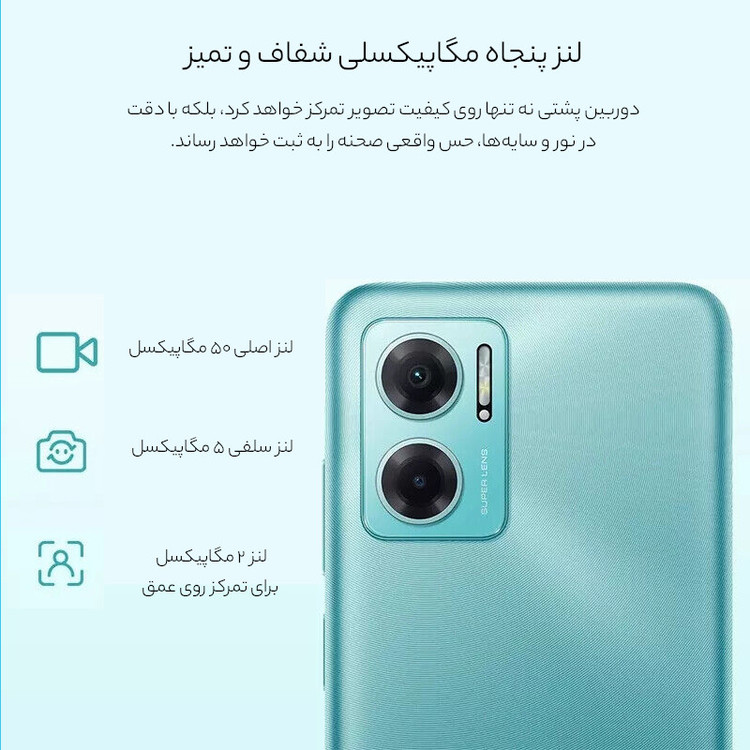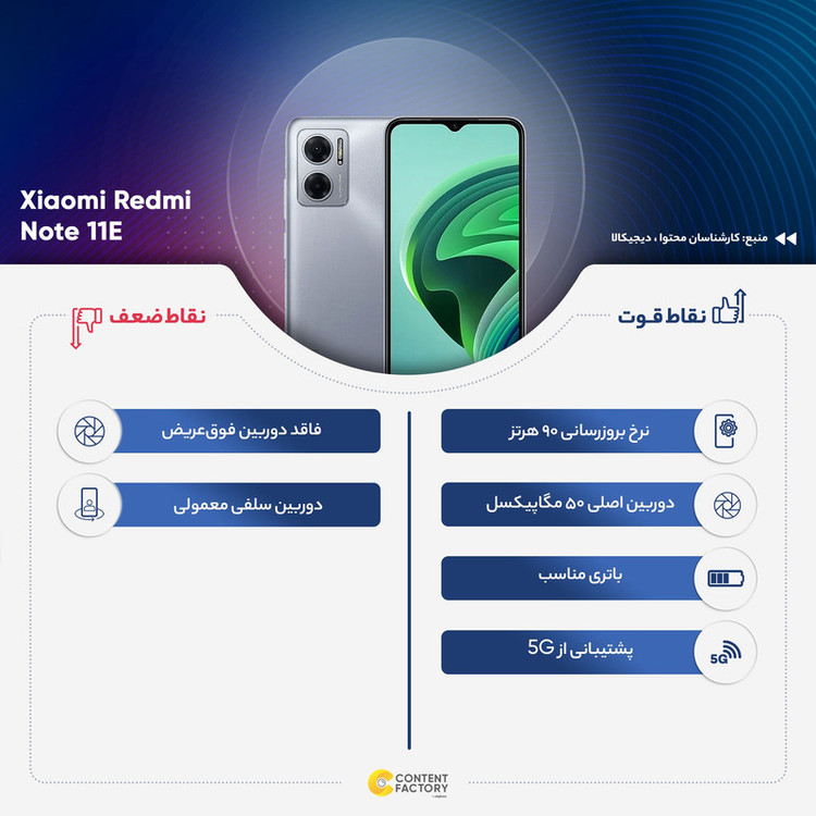 در بین گوشیهای هوشمند میانرده سری Redmi شرکت شیائومی، شاهد رونمایی برخی از گوشیهایی بودیم که از قیمتی مقرون بهصرفهتری بهره برده بودند. شیائویم Redmi Note 11E هم یکی از این گوشیهای هوشمند باکیفیت و مقرون بهصرفه این شرکت است. طراحی در نظر گرفته شده برای این گوشی هوشمند سعی دارد تا خود را بهعنوان یک گوشی رده بالا و پرچمدار معرفی کند و در این زمینه هم موفق بوده است. در نمای روبهرویی این گوشی به صفحهنمایش با ابعاد 6.58 اینچ و رزولوشن 1080×2408 پیکسل از نوع IPS مجهز شده است. از جمله قابلتهای قدرتمند این صفحهنمایش، میتوانیم به نرخ بروزرسانی 90 هرتز و نمایش 401 پیکسل در هر اینچ اشاره کنیم. بریدگی قطرهای شکل ناچ در قسمت بالایی و مرکزی صفحهنمایش، سنسور دوربین سلفی با رزولوشن 5 مگاپیکسل را در خود جای داده است که برای ثبت تصاویر در نور روز و تماسهای تصویری، عملکرد قابل قبولی دارد. در بخش سنسورهای قسمت پشتی هم یک سنسور دوربین اصلی با رزولوشن 50 مگاپیکسل از نوع عریض با گشودگی دریچه دیافراگم f/1.8 در کنار سنسور 2 مگاپیکسل سنجش عمق، دوربین دوگانه این گوشی هوشمند را تشکیل میدهند. در بخش مشخصات سختافزاری یکی از بهترین پردازندههای میانرده شرکت مدیاتک، یعنی دیمنسیتی 700 این گوشی هوشمند را همراهی میکند. حضور چنین پردازندهای سبب شده تا شیائومی Redmi Note 11E توانایی ارائه عملکرد قابل قبولی در اجرای بازیهای محبوب و نرمافزارهای کاربردی داشته باشد. باتری با میزان ظرفیت 5000 میلیآمپرساعت در کنار پشتیبانی از فناوری شارژ سریع با توان 18 وات، از دیگر مشخصات در نظر گرفته شده است. اگر به دنبال خرید گوشی هوشمند میانردهای هستید که از قیمتی مقرون بهصرفهای بهره برده باشد و از طرفی عملکرد قابل قبولی داشته باشد، شیائومی Redmi Note 11E میتواند گزینه مناسبی برای شما باشد.