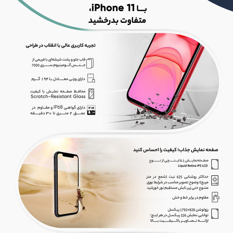 گوشی موبایل «iPhone 11» یکی از سه گوشی شرکت اپل است که در کنفرانس سال 2019 این شرکت معرفی شد. این گوشی نسبت به گوشیهای Pro و Pro Max قیمت پایینتری دارد اما طراحی مشابهی با این محصولات دارد. یکی از اصلیترین تفاوتهای این گوشی با دو گوشی دیگر، نمایشگر آیفون 11 است به فناوری Liquid Retina مجهز شده است تا قیمت تمام شده کمتری داشته باشد. البته این نمایشگر رزولوشن رضایتبخشی دارد؛ بهطوریکه در اندازهی 6.1 اینچیاش، حدود 326 پیکسل را در هر اینچ جا داده است که میزان مطلوبی به حساب میآید. قاب پشتی آیفون جدید هم از شیشه ساخته شده تا هم گوشی مشکل آنتندهی نداشته باشد و هم امکان شارژ بیسیم باتری در این گوشی وجود داشته باشد. البته قابی آلومینیومی این بدنه شیشهای را در خود جای داده است. این بدنهی زیبا در مقابل خطوخش مقاومت زیادی دارد؛ پس خیالتان از این بابت که آب و گردوغبار بهراحتی روی آیفون 11 تأثیر نمیگذارد، راحت باشد. علاوهبراین لکه و چربی هم روی این صفحهنمایش باکیفیت تأثیر چندانی ندارند اما این هم پایان کار نیست، آیفون جدید میتواند به مدت 30 دقیقه در عمق 2 متری آب دوام بیاورد. تشخیص چهره با استفاده از دوربین جلو دیگر ویژگی است که در آیفون جدید اپل به کار گرفته شده است. اما جالبترین و واضحترین تفاوت در این محصول جدید، دوربینهایی است که به شکل دوگانه در قاب پشتی جا خوش کردهاند. دو دوربین با سنسورهای 12مگاپیکسلی عکسهایی با کیفیتِ کاملاً رضایتبخش را به کاربر هدیه میدهد. دو دوربین که یکی از آنها SL سهبعدی است هم دیگر بهروزرسانی در آیفون 11 است. قابلیت اتصال به شبکههای 4G، بلوتوث نسخهی 5، نسخهی 13 از iOS دیگر ویژگیهای این گوشی هستند. ازنظر سختافزاری هم این گوشی از تراشهی جدید A13 بهره میبرد که تا بتواند علاوه بر کارهای معمول، از قابلیتهای جدید واقعیت مجازی که اپل این روزها روی آن تمرکز خاصی دارد، پشتیبانی کند. گوشی جدید اپل به باتری 3110 میلیآمپرساعتی، فناوری شارژ سریع PD2.0، فناوری شارژ بیسیم و استاندارد صوتی دالبی هم مجهز شده است. پارت نامبر این محصول ZAA است.
