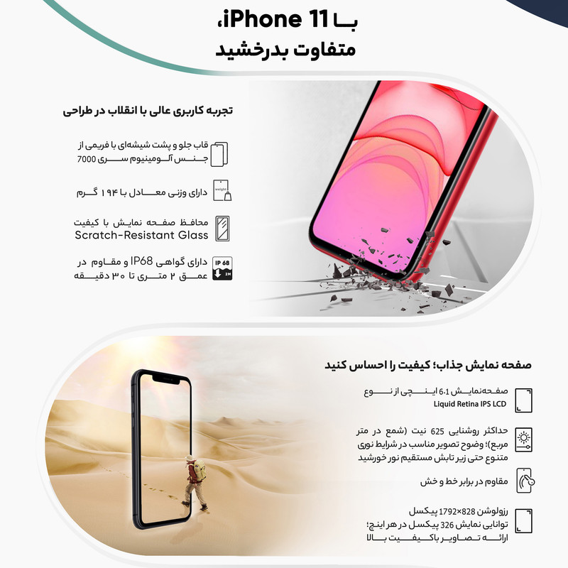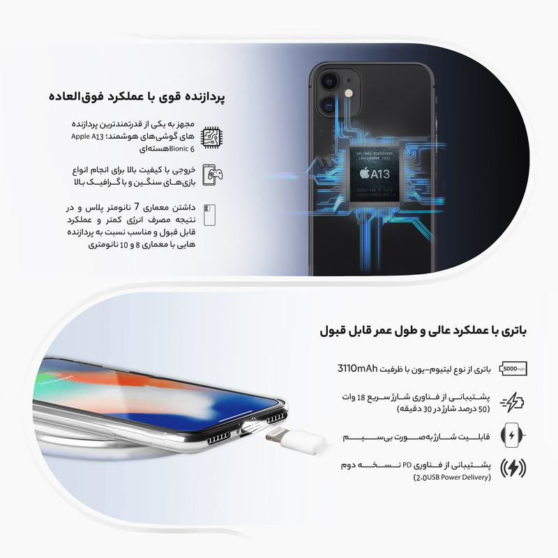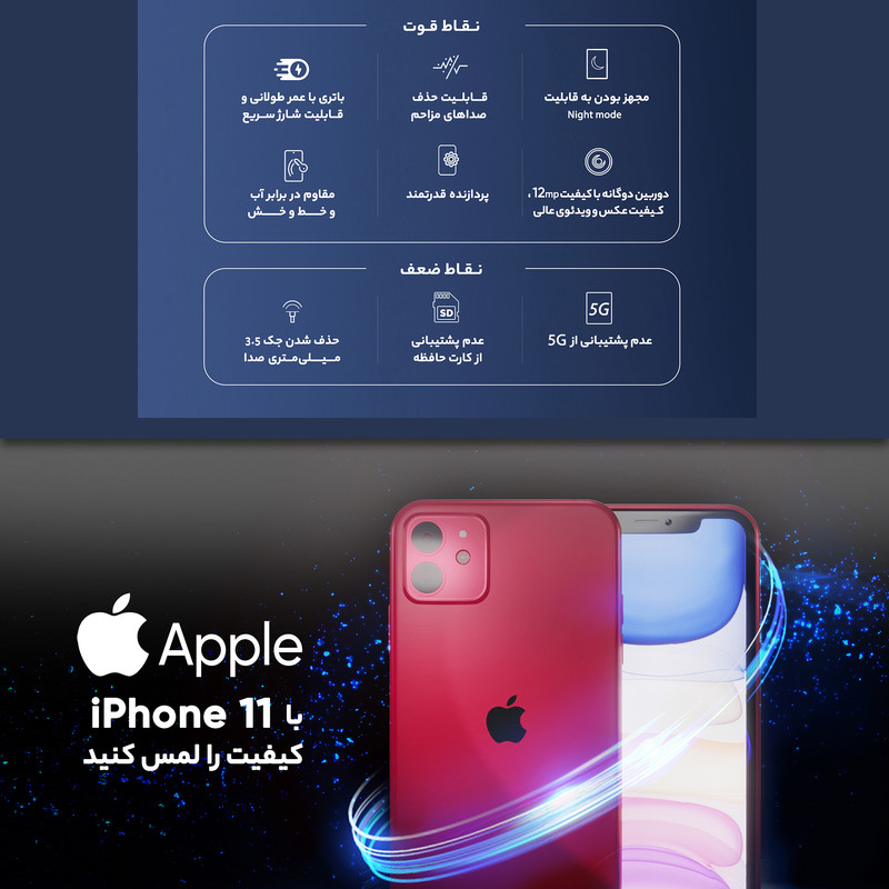 گوشی موبایل «iPhone 11» یکی از سه گوشی شرکت اپل است که در کنفرانس سال 2019 این شرکت معرفی شد. این گوشی نسبت به گوشیهای Pro و Pro Max قیمت پایینتری دارد اما طراحی مشابهی با این محصولات دارد. یکی از اصلیترین تفاوتهای این گوشی با دو گوشی دیگر، نمایشگر آیفون 11 است به فناوری Liquid Retina مجهز شده است تا قیمت تمام شده کمتری داشته باشد. البته این نمایشگر رزولوشن رضایتبخشی دارد؛ بهطوریکه در اندازهی 6.1 اینچیاش، حدود 326 پیکسل را در هر اینچ جا داده است که میزان مطلوبی به حساب میآید. قاب پشتی آیفون جدید هم از شیشه ساخته شده تا هم گوشی مشکل آنتندهی نداشته باشد و هم امکان شارژ بیسیم باتری در این گوشی وجود داشته باشد. البته قابی آلومینیومی این بدنه شیشهای را در خود جای داده است. این بدنهی زیبا در مقابل خطوخش مقاومت زیادی دارد؛ پس خیالتان از این بابت که آب و گردوغبار بهراحتی روی آیفون 11 تأثیر نمیگذارد، راحت باشد. علاوهبراین لکه و چربی هم روی این صفحهنمایش باکیفیت تأثیر چندانی ندارند اما این هم پایان کار نیست، آیفون جدید میتواند به مدت 30 دقیقه در عمق 2 متری آب دوام بیاورد. تشخیص چهره با استفاده از دوربین جلو دیگر ویژگی است که در آیفون جدید اپل به کار گرفته شده است. اما جالبترین و واضحترین تفاوت در این محصول جدید، دوربینهایی است که به شکل دوگانه در قاب پشتی جا خوش کردهاند. دو دوربین با سنسورهای 12مگاپیکسلی عکسهایی با کیفیتِ کاملاً رضایتبخش را به کاربر هدیه میدهد. دو دوربین که یکی از آنها SL سهبعدی است هم دیگر بهروزرسانی در آیفون 11 است. قابلیت اتصال به شبکههای 4G، بلوتوث نسخهی 5، نسخهی 13 از iOS دیگر ویژگیهای این گوشی هستند. ازنظر سختافزاری هم این گوشی از تراشهی جدید A13 بهره میبرد که تا بتواند علاوه بر کارهای معمول، از قابلیتهای جدید واقعیت مجازی که اپل این روزها روی آن تمرکز خاصی دارد، پشتیبانی کند. گوشی جدید اپل به باتری 3110 میلیآمپرساعتی، فناوری شارژ سریع PD2.0، فناوری شارژ بیسیم و استاندارد صوتی دالبی هم مجهز شده است. پارت نامبر این محصول ZAA است.