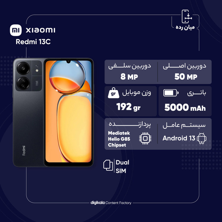 شاید شما هم به دنبال خرید گوشی هوشمندی باشید که در کنار بهره بردن از مشخصات فنی مناسب، قیمت مقرون بهصرفهای هم داشته باشد و شیائومی Redmi 13C میتواند یکی از انتخابهای مناسب برای شما باشد. این گوشی به نسبت قیمت در نظر گرفته شده از مشخصات فنی مناسبی بهره برده است. در نمای روبهرویی این گوشی به صفحهنمایش با ابعاد 6.74 اینچ و رزولوشن 720×1600 پیکسل از نوع IPS مجهز شده که توانایی نمایش 260 پیکسل در هر اینچ را دارد. در مورد صفحهنمایش این گوشی باید بگوییم که باید توقعی در حد و اندازه یک گوشی اقتصادی را از آن داشته باشید و از طرفی نرخ بروزرسانی 90 هرتز آن سبب شده تا عملکرد به نسبت روان و بدون لگ داشته باشد. در قسمت پشتی این گوشی شاهد قرارگیری یک سنسور دوربین اصلی با رزولوشن 50 مگاپیکسل در کنار سنسور 2 مگاپیکسل ماکرو هستیم. سنسور دوربین اصلی 50 مگاپیکسل این گوشی برای عکاسی در نور روز و در جایگاه یک گوشی میانرده میتواند توقعات شما را تا میزان بسیار زیادی برآورده کند. دوربین سلفی 8 مگاپیکسل هم برای برقراری تماسهای تصویری عملکرد بسیار خوب و کاملا قابل قبولی دارد. حضور پردازنده هلیو G85 شرکت مدیاتک هم سبب شده تا شیائومی Redmi 13C در اجرای بازیهای نهچندان سنگین و فعالیتهای روزمره، عملکرد روان و مناسبی داشته باشد. این گوشی به باتری با میزان ظرفیت 5000 میلیآمپرساعت مجهز شده که باید بدانید به ازای هر بار شارژ صد درصدی، توانایی ارائه زمان آماده بهکار یک و نیم روز را برای حالت استفاده معمولی دارد. در مجموع باید بگوییم که با یک گوشی به نسبت اقتصادی روبهرو هستید که به ازای قیمت در نظر گرفته شده از مشخصات مناسبی بهره برده و از طرفی برای استفاده روزمره گزینه بسیار مناسبی است.