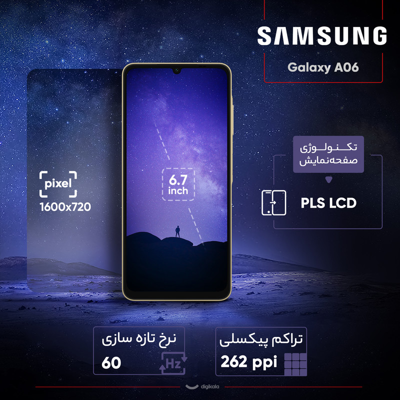 Samsung Galaxy A06 یکی از گوشیهای اقتصادی و جدید سامسونگ است که با طراحی شیک، صفحهنمایش بزرگ و باتری قدرتمند، گزینهای ایدهآل برای کاربران روزمره محسوب میشود. این گوشی دارای نمایشگر 6.7 اینچی PLS LCD با رزولوشن 720x1600 پیکسل است که تجربه بصری مناسبی را ارائه میدهد. در بخش دوربین، از یک حسگر 50 مگاپیکسلی در کنار دوربین ماکرو 2 مگاپیکسلی استفاده شده است که در شرایط نوری مناسب، تصاویر واضح و باکیفیتی ثبت میکند. سامسونگ در این مدل از پردازنده MediaTek Helio G85 استفاده کرده که برای کارهای روزمره و اجرای برنامههای معمولی، عملکرد خوبی دارد. این گوشی با سیستمعامل اندروید 14 و رابط کاربری One UI 6.1 عرضه شده که تجربه نرمافزاری بهروزی را برای کاربران به همراه دارد. همچنین، باتری 5000 میلیآمپر ساعتی آن، شارژدهی بالایی دارد و از شارژ سریع 25 واتی پشتیبانی میکند. اگر به دنبال یک گوشی هوشمند با قیمت مناسب و امکانات قابل قبول هستید، Galaxy A06 گزینهای ارزشمند خواهد بود.
