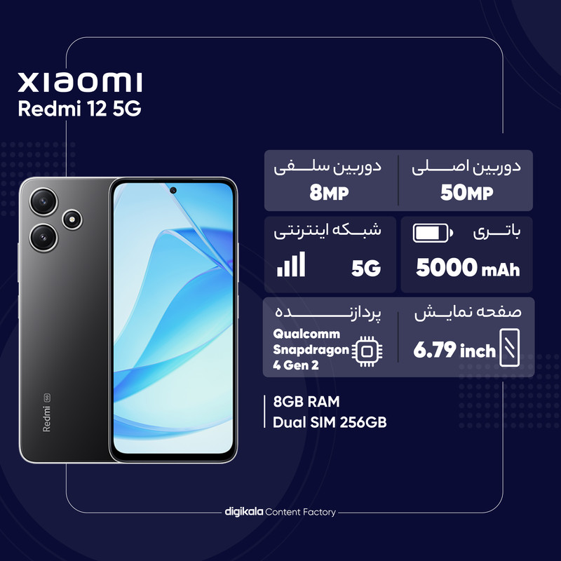 گوشی موبایل شیائومی مدل Redmi 12 5G دو سیم کارت ظرفیت 256 گیگابایت و رم 8 گیگابایت - گلوبال - نسخه به همراه شارژر
