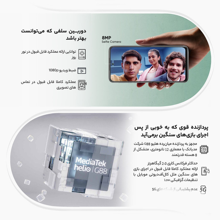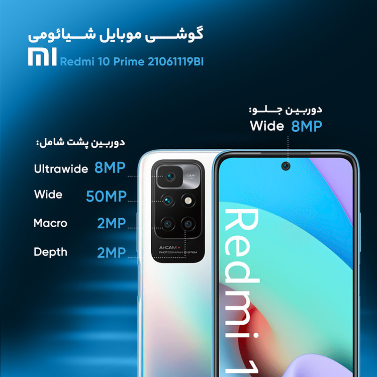 شیائومی Redmi 10 Prime 21061119BI یکی از گوشیهای هوشمند میانرده سطح بالا این شرکت است که در جایگاه یک گوشی هوشمند میانرده به مشخصات فنی قدرتمندی مجهز شده است. در نمای روبهرویی این گوشی به صفحهنمایش زیبا با ابعاد 6.5 اینچ و رزولوشن 1080×2400 پیکسل از نوع LCD مجهز شده است. توانایی نمایش 405 پیکسل در هر اینچ و نرخ بروزرسانی 90 هرتز، خبر از آن میدهد که با صفحهنمایش باکیفیتی روبهرو هستیم. در قسمت پشتی هم یک سنسور دوربین اصلی با رزولوشن 50 مگاپیکسل از نوع عریض و گشودگی دریچه دیافراگم f/1.8 در کنار سنسور 8 مگاپیکسل از نوع فوق عریض (ultrawide) با زاویه دید 120 درجه و دو سنسور 2 مگاپیکسل از نوع ماکرو و سنجش عمق، سنسورهای دوربین چهارگانه این گوشی هوشمند میانرده را تشکیل میدهند. بریدگی دایرهای شکل ناچ در قسمت بالایی و مرکزی صفحهنمایش هم سنسور دوربین سلفی با رزولوشن 8 مگاپیکسل را در خود جای داده است. در بخش مشخصات سختافزاری هم شیائومی Redmi 10 Prime 21061119BI به پردازنده میانرده هلیو G88 شرکت مدیاتک (MediaTek Helio G88) مجهز شده است. باتری قدرتمند با میزان ظرفیت 6000 میلیآمپرساعت هم سبب شده تا این گوشی هوشمند به ازای هر بار شارژ 100 درصدی، طول عمر مفید (زمان آماده بهکار) حتی بیشتر از دو روز را در شرایط استفاده معمولی ارائه کند. شارژر با توان 18 وات و مجهز به فناوری شارژ سریع هم این گوشی میانرده را همراهی میکند.