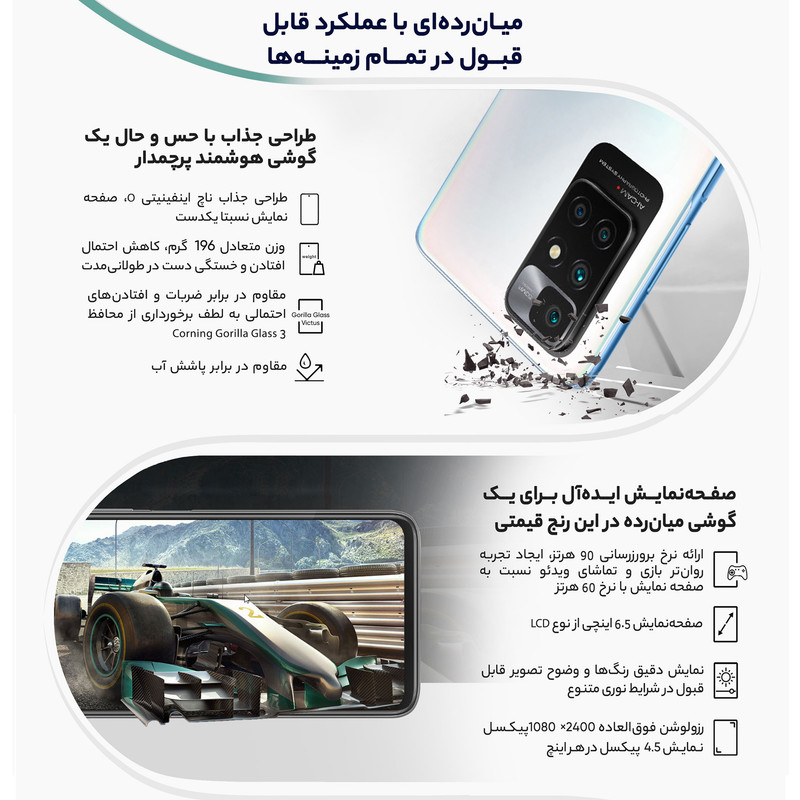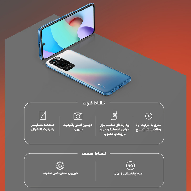 شیائومی Redmi 10 Prime 21061119BI یکی از گوشیهای هوشمند میانرده سطح بالا این شرکت است که در جایگاه یک گوشی هوشمند میانرده به مشخصات فنی قدرتمندی مجهز شده است. در نمای روبهرویی این گوشی به صفحهنمایش زیبا با ابعاد 6.5 اینچ و رزولوشن 1080×2400 پیکسل از نوع LCD مجهز شده است. توانایی نمایش 405 پیکسل در هر اینچ و نرخ بروزرسانی 90 هرتز، خبر از آن میدهد که با صفحهنمایش باکیفیتی روبهرو هستیم. در قسمت پشتی هم یک سنسور دوربین اصلی با رزولوشن 50 مگاپیکسل از نوع عریض و گشودگی دریچه دیافراگم f/1.8 در کنار سنسور 8 مگاپیکسل از نوع فوق عریض (ultrawide) با زاویه دید 120 درجه و دو سنسور 2 مگاپیکسل از نوع ماکرو و سنجش عمق، سنسورهای دوربین چهارگانه این گوشی هوشمند میانرده را تشکیل میدهند. بریدگی دایرهای شکل ناچ در قسمت بالایی و مرکزی صفحهنمایش هم سنسور دوربین سلفی با رزولوشن 8 مگاپیکسل را در خود جای داده است. در بخش مشخصات سختافزاری هم شیائومی Redmi 10 Prime 21061119BI به پردازنده میانرده هلیو G88 شرکت مدیاتک (MediaTek Helio G88) مجهز شده است. باتری قدرتمند با میزان ظرفیت 6000 میلیآمپرساعت هم سبب شده تا این گوشی هوشمند به ازای هر بار شارژ 100 درصدی، طول عمر مفید (زمان آماده بهکار) حتی بیشتر از دو روز را در شرایط استفاده معمولی ارائه کند. شارژر با توان 18 وات و مجهز به فناوری شارژ سریع هم این گوشی میانرده را همراهی میکند.