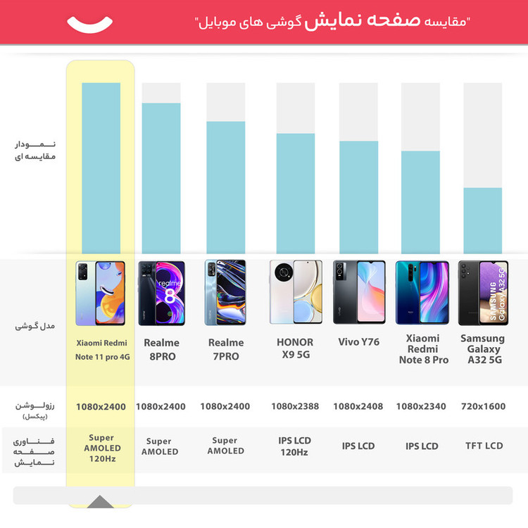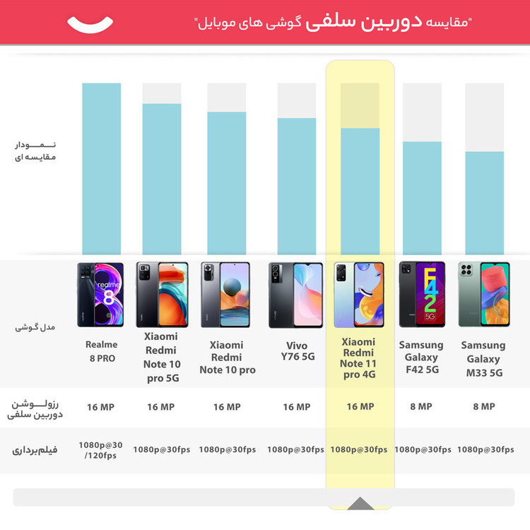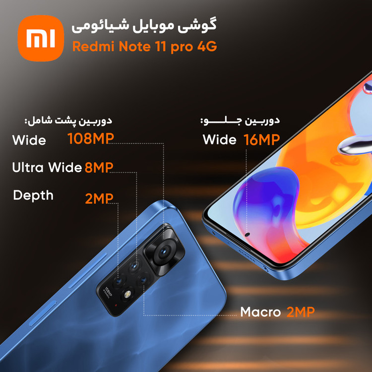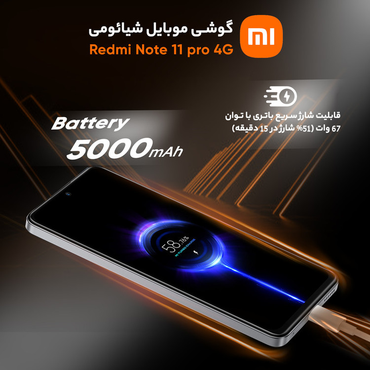 Redmi Note 11 Pro 4G یکی از گوشی میانرده باکیفیت شرکت شیائومی است که به لطف بهره بردن از مشخصات فنی مناسب، توانایی ارائه عملکرد بسیار خوب و کاملا قابل قبولی را دارد. گوشی موبایل شیائومی مدل Redmi Note 11 pro 4G دو سیم کارت ظرفیت 128 گیگابایت و رم 6 گیگابایت به صفحهنمایش با ابعاد 6.67 اینچ با رزولوشن 1080×2400 پیکسل از نوع Super AMOLED مجهز شده که توانایی نمایش 120 هرتز را دارد. باید بگوییم که با صفحهنمایش بسیار باکیفیتی روبهرو هستید که عملکرد بسیار خوبی خواهد داشت. بریدگی دایرهای شکل ناچ اینفینیتی O در قسمت بالایی و مرکزی صفحهنمایش، سنسور دوربین سلفی را با رزولوشن 16 مگاپیکسل در خود جای داده است. یک سنسور دوربین اصلی با رزولوشن 108 مگاپیکسل از نوع عریض (wide) در کنار سنسور 8 مگاپیکسل از نوع فوق عریض (ultrawide) با زاویه دید 118 درجه و دو سنسور با رزولوشن 2 مگاپیکسل از نوع سنجش عمق و ماکرو، سنسورهای دوربین چهارگانه شیائومی Redmi Note 11 Pro 4G را تشکیل میدهند. این گوشی در بین گوشیهای هوشمند میانرده به یکی از قدرتمندترین سنسورهای دوربین اصلی مجهز شده است که بدون شک عملکرد بسیار خوبی دارد. حضور پردازنده میانرده هلیو G96 شرکت مدیاتک هم سبب شده تا این گوشی عملکرد قابل قبولی را در اجرای بازی و نرمافزارهای کاربردی و محبوب داشته باشد. برای گوشی شیائومی نوت 11 پرو Android 11 در نظر گرفته شده است. باتری با میزان ظرفیت 5000 میلیآمپرساعت و شارژر 67 وات مجهز به تکنولوژی شارژ سریع هم از دیگر مشخصات در نظر گرفته شده هستند. شارژر قدرتمند این گوشی توانایی شارژ 51 درصدی باتری Redmi Note 11 Pro 4G را در مدت زمان 15 دقیقه دارد.