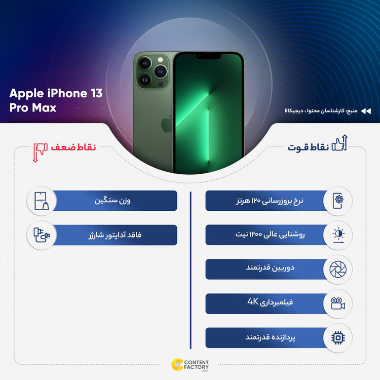 آیفون 13 پرو مکس، آیفون 13 پرو، آیفون 13 و آیفون 13 مینی از محبوبترین گوشیهای هوشمند شرکت اپل شناخته میشوند. آیفون 13 پرو مکس بدون شک به مشخصات فنی قدرتمندتری به نسبت مابقی اعضای این خانواده مجهز شده است. البته، گوشیهای این خانواده از نظر طراحی تفاوت چندانی با نسل قبلی پرچمداران این شرکت ندارند و تنها وجه تمایز در بین این گوشیها به استفاده از ناچ با عرض کمتر خلاصه میشود. آیفون 13 پرو مکس به صفحهنمایشی 6.7 اینچی با رزولوشن 1284×2778 پیکسل مجهز شده است. برای اولین بار در تاریخ گوشیهای هوشمند اپل، صفحهنمایش در نظر گرفته شده برای آیفون 13 پرو مکس توانایی ارائه نرخ بروزرسانی 120 هرتز را دارد که بدون شک میتواند عملکردی روانتر و به مراتب باکیفیتتر نسبت به نسلهای قبلی خود ارائه کند. این صفحهنمایش توانایی ارائه حداکثر روشنایی 1200 نیت (شمع در متر مربع) را دارد که همین امر سبب میشود تا در شرایط نوری متنوع و حتی زیر تابش مستقیم نور خورشید هم وضوح تصویر بسیار خوبی داشته باشد. در قسمت پشتی این گوشی، سه سنسور دوربین به همراه یک سنسور LIDAR با همان طراحی آیفون 12 پرو مکس قرار گرفتهاند. یک سنسور دوربین اصلی با رزولوشن 12 مگاپیکسلی با گشودگی دریچه دیافراگم f/1.5، سنسور دوربین 12 مگاپیکسلی از نوع فوق عریض (Ultra Wide) و سنسور 12 مگاپیکسلی از نوع تله فوتو، دوربین سهگانه آیفون 13 پرو مکس را تشکیل میدهند. پردازنده A15 بایونیک هم اینبار قدرتمندتر از همیشه متشکل از شش هسته این پرچمدار قدرتمند را همراهی میکند. گوشیهای نات اکتیو با قرار گرفتن سیمکارتهای داخلی اکتیو میشوند و برخلاف مدل اکتیو پلمپ کالا باز نشده است. گوشیهای اکتیو برند اپل هم به این شکل هستند که به دلیل محدودیتهای برخی از محصولات اپل برای کشور ایران، در کشورهای همسایه بهصورت رسمی با یک بار قرار گرفتن سیمکارت، اکتیو شده و پلمپ میشوند و باید بدانید که این پروسه هیچ مشکلی در راستای گارانتی کالا بههمراه ندارد. پارتنامبرهای اروپا و ژاپن و امارات تک سیمکارت هستند و پارتنامبرهای مربوط به امارات هم از فیس تایم پشتیبانی نمیکنند. پارتنامبر JA (ژاپن) هم حتی در حالت سایلنت صدای شاتر عکس قطع نمیشود.